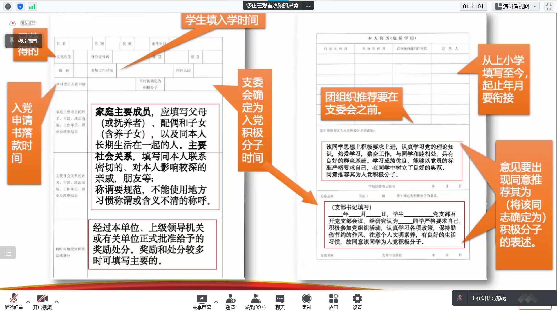 姚硕向同学们介绍了党员发展工作流程及注意事项,她希望各学生党支部委员严格执行党员发展工作流程,注意材料填写细节,并强调入党积极分子、发展对象要端正态度,认真学习,严格遵守党员发展流程。