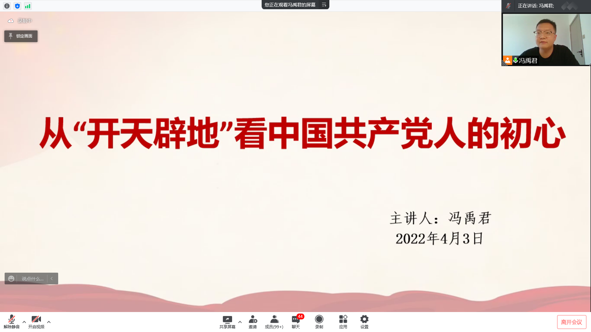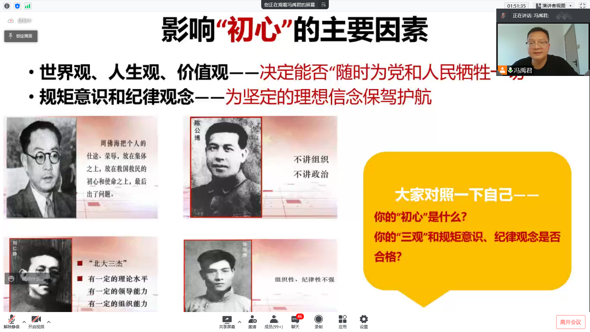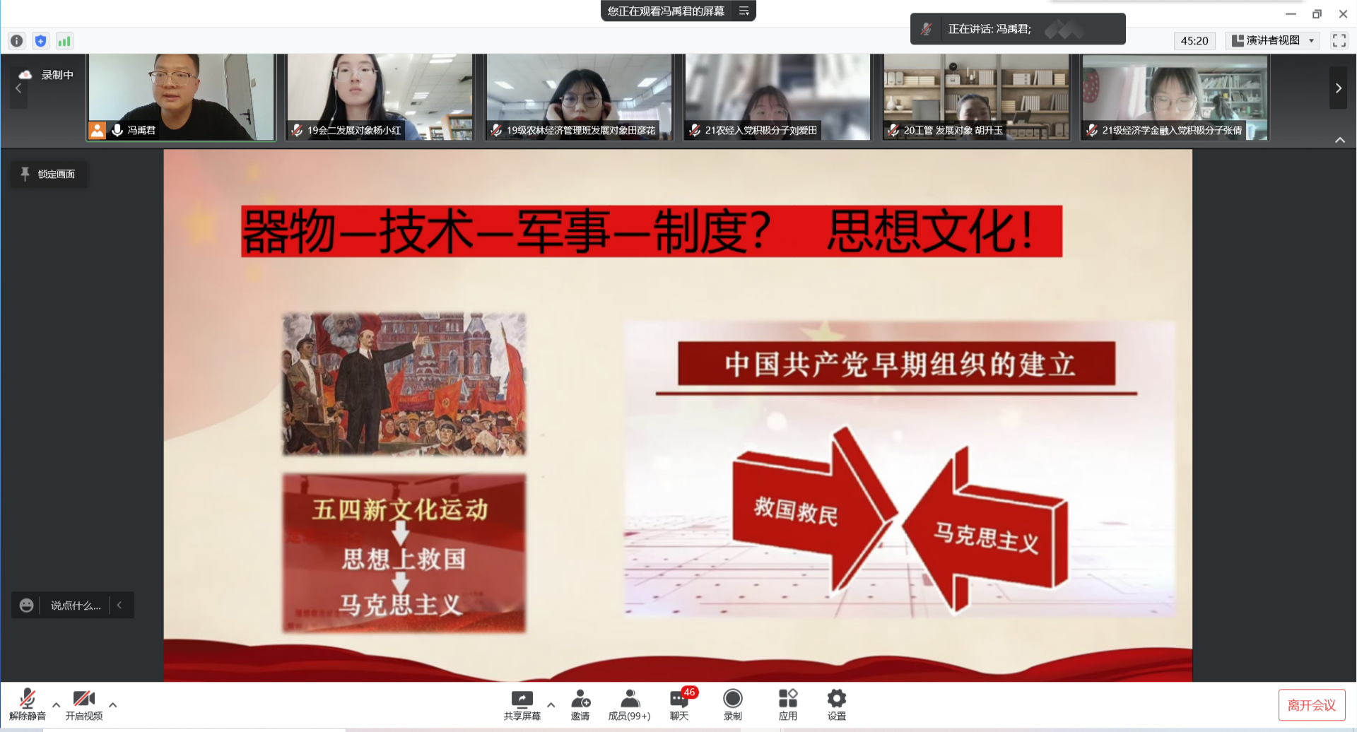 冯禹君以“开天辟地看中国共产党人的初心”为主题,带领同学们回顾了1840年以来各阶层仁人志士为拯救民族危亡处境所做的努力,并着重讲解了马克思主义传入中国的历史渊源和中共一大召开的历史背景、具体细节。他以中共一大各位代表的事迹为例,讲述了影响“初心”的主要因素—世界观、人生观、价值观和规矩意识、纪律观念,它们决定着一位党员能否随时为党和人民牺牲一切,为自己坚定的理想信念保驾护航。