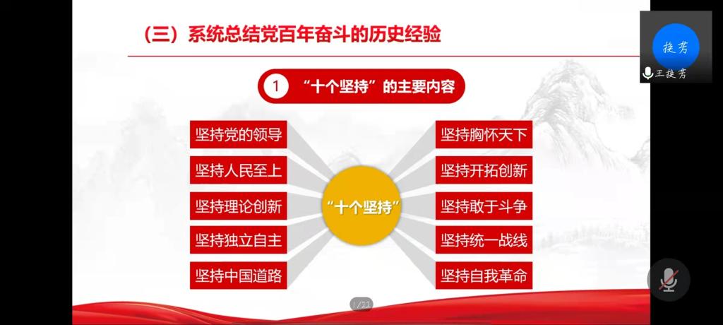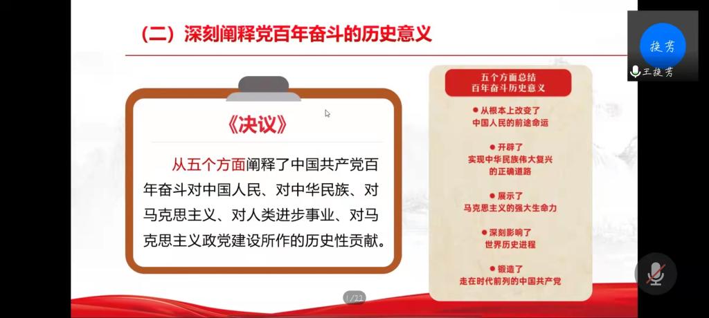 巍巍巨轮,行稳致远。王换芳讲解十九届六中全会通过的《中共中央关于党的百年奋斗重大成就和历史经验的决议》具有更加宽广的历史视野、更加深邃的思想理论、更加主动的战略谋划、更加突出的世界意义。使我们深刻理解了党的百年奋斗重大成就和历史经验,不断提高政治判断力、政治领悟力、政治执行力,做到“两个维护”,更加坚定奋进新时代新征程的信心决心。