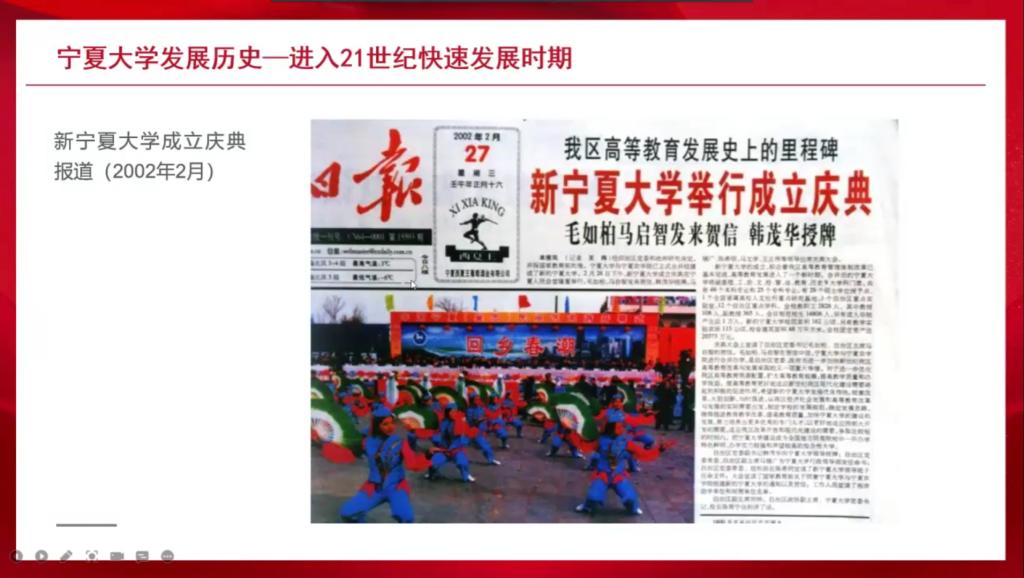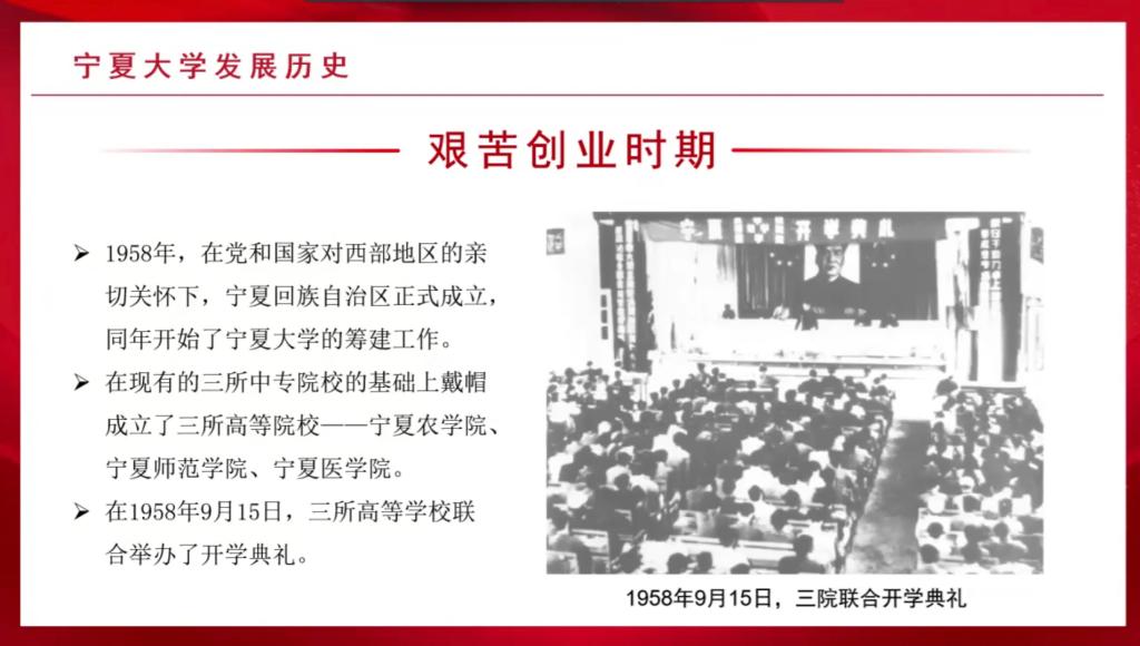 的发展历史,从艰苦创业时期到经历改革开放时期,再进入21世纪后快速发展,一代又一代宁大人以坚强的沙枣树精神艰难前行,为宁夏、西北地区乃至全国培养人才,贡献力量。