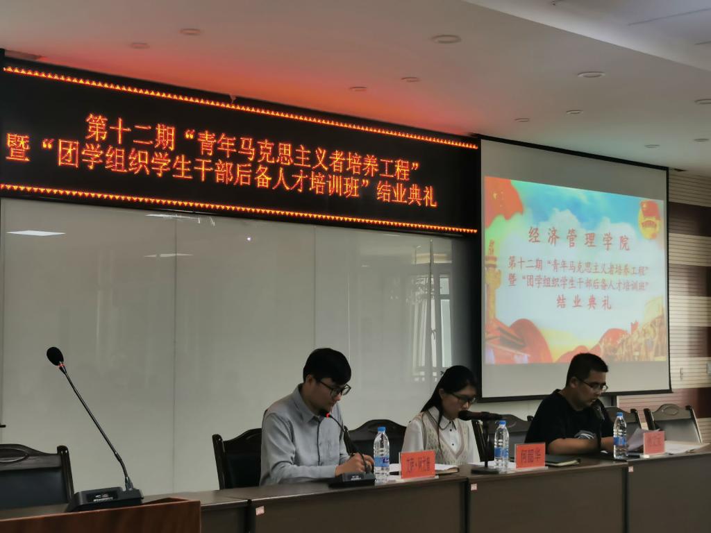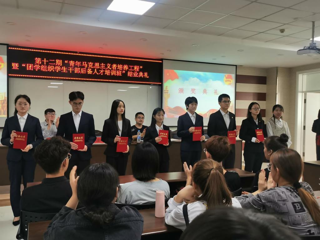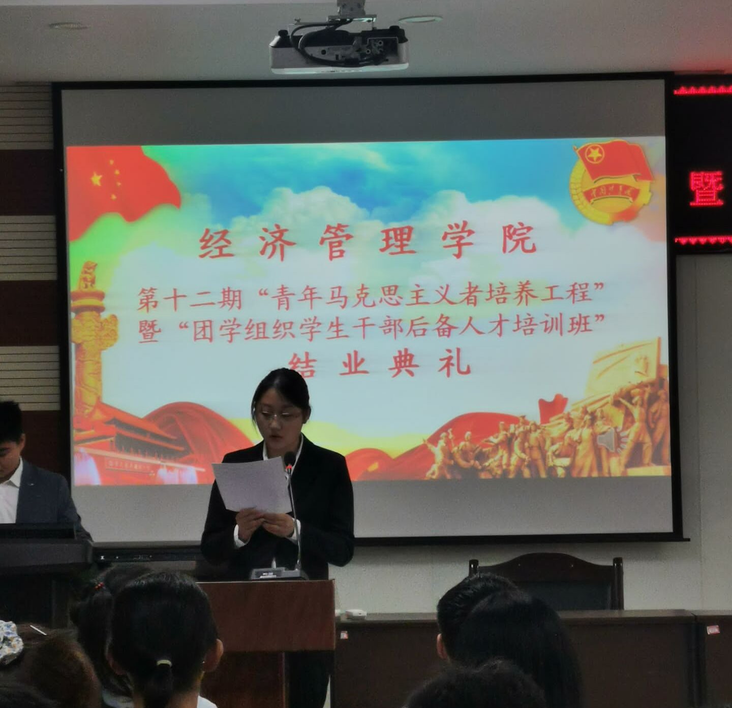贺兰山校区文荟楼316报告厅举行了第十二期“青年马克思主义者培养工程”暨“团学组织学生干部后备人才培训班”结业典礼,学生工作办公室负责人何韶华、学生工作办公室辅导员艾萨、孙文元及第十二期青马班结业成员到场参加。典礼由艾萨主持。