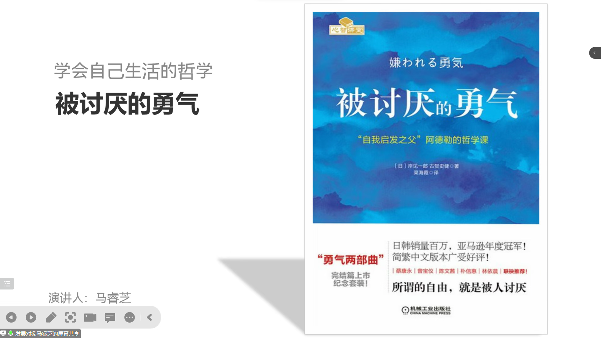 发展对象张怡凡推荐了《青春万岁》一书,并从第一印象、深入了解和心得体会三方面展开了分享。发展对象马睿芝从人生不可避免的烦恼、前往幸福之路的起点和实践“自我”的哲学三方面介绍了《被讨厌的勇气》。发展对象张瑞从作者简介、故事梗概、角色性格和词句欣赏四方面讲解了《平凡的世界》一书。积极分子张粤针对《小王子》阐释了自己的心得体会和深入思考。积极分子马百灵分享了对《明朝那些事儿》的相关感悟。