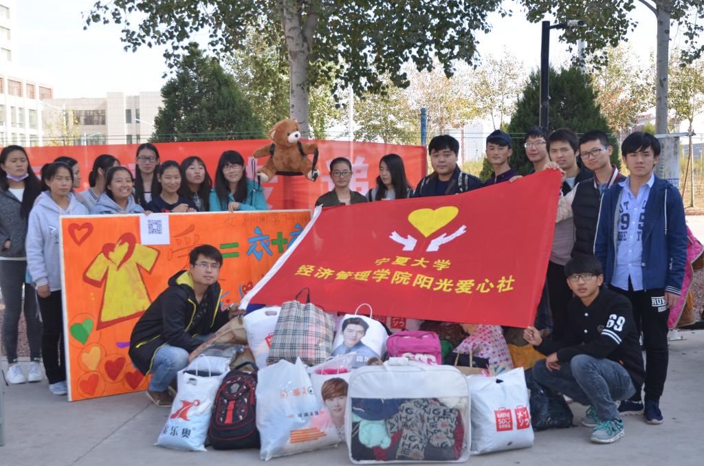宁夏回族自治区地处大西北,宁南仍有山区八县尚未摆脱贫困,挣扎在温饱线上。许多适学儿童没有课本,没有御寒的衣物。本着“为了让生命有同样温暖,让每一个孩子有相同的笑脸,同时也为了激发当代大学生的社会责任感”的活动目的,阳光爱心社在食堂门口设立了一个物品捐赠点,倡导每一位学生捐赠自己的旧物品。学生们捐的是衣服,收获的是获赠孩子温暖的冬天;捐的是书,收获的是适学儿童孜孜不倦学习的保障;捐的是身外之物,收获的是人性本真善良带来的自我满足。仿佛正因为这片土地上的人心温暖,久违的阳光也露了脸。