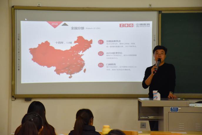 宣讲人从企业简介、企业愿景、职位描述、薪资待遇等方面展开讲解。中博教育成立于2004年,集团一直秉持“扎根生涯教育,推动行业发展”的企业愿景,着力于ACCA、CMA、CFA等国际财经金融证书培训工作,业务范围涉及财经网络教育、企业内训、考研培训、语言培训以及国际留学。本次招聘针对经济管理类专业设立了市场专员岗位,这对于经管类专业同学而言是一个很好的工作机会。对于职工考察期,中博教育提出——“唯态度,唯能力”的工作要求,十分重视人才引入与培养,这使其在业内拥有了良好口碑。继而,宣讲人提道,中博教育薪资条件在行业内位居前列,企业为职工提供了优越的薪资待遇和舒适的工作环境,深受求职者青睐。最后,宣讲人进一步讲述了本次招聘的具体流程,宣讲会至此结束。