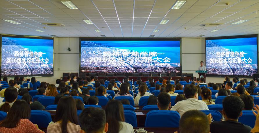 于贺兰山校区文荟楼东报告厅举行了2016级专业实习汇报会,西部发展研究中心副主任王国庆、院教科办主任张逸参加了本次报告会,各专业负责人担任评委,16级全体学生到场参加。
