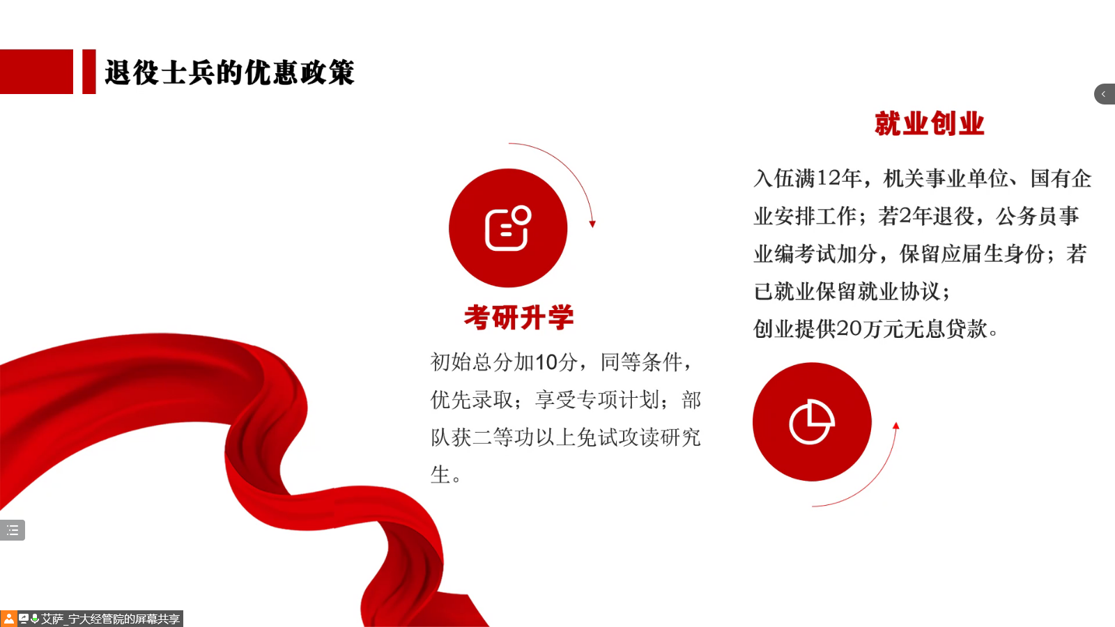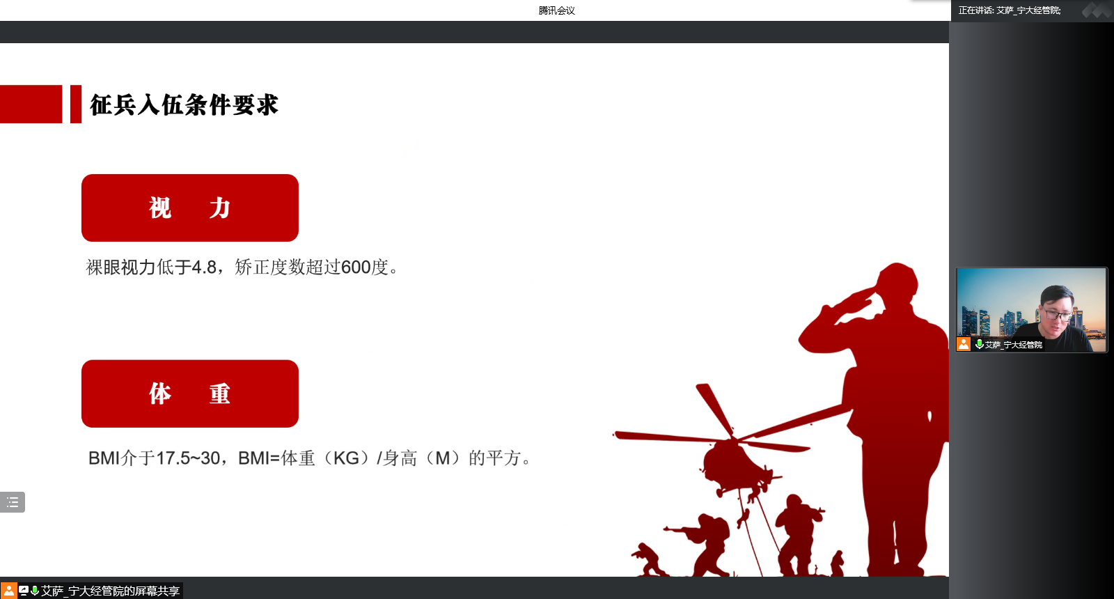 会议中,艾萨就征兵入伍的条件要求、参军入伍的意义以及具体的优惠政策三个方面帮助同学们深入了解相关政策并积极参军报国。首先,艾萨介绍了视力、体重、身高和年龄的具体标准;其次简洁明了地概括了应征入伍的优点;最后,提到优惠政策,他介绍到退役士兵不仅可以享受经济上的优惠,而且在考研升学、就业创业等方面都会得到很大的帮助。