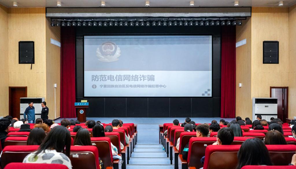 贺兰山校区科技楼一楼报告厅为各学院学生代表开展防电信诈骗安全知识讲座。