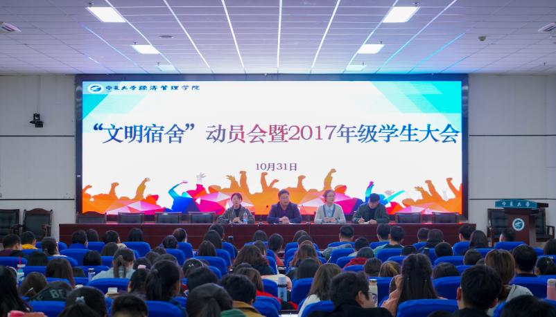 于贺兰山校区文荟楼东报告厅举行了“文明宿舍”动员会暨2017级学生大会。学院党委副书记程胜利、各年级辅导员和2017级全体学生参加本次会议。2017级辅导员姚硕主持本次会议。