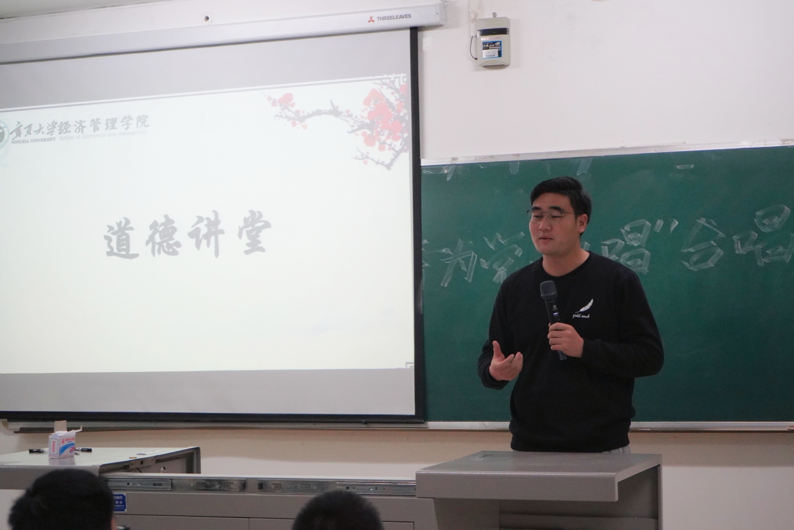 禹文杰通过讲述身边的事例告诉同学们诚信对于一个人学习、事业、交际的重要性。“有德无才,才不足以助其成;有才无德,德必铸其奸。”禹文杰指出道德始终位于人性的制高点,青年一代作为社会主义的建设者与接班人,要始终严格要求自己,以“诚”待人,以“信”行事,用实际行动塑造良好的学风、考风,诚信应考,创造佳绩。