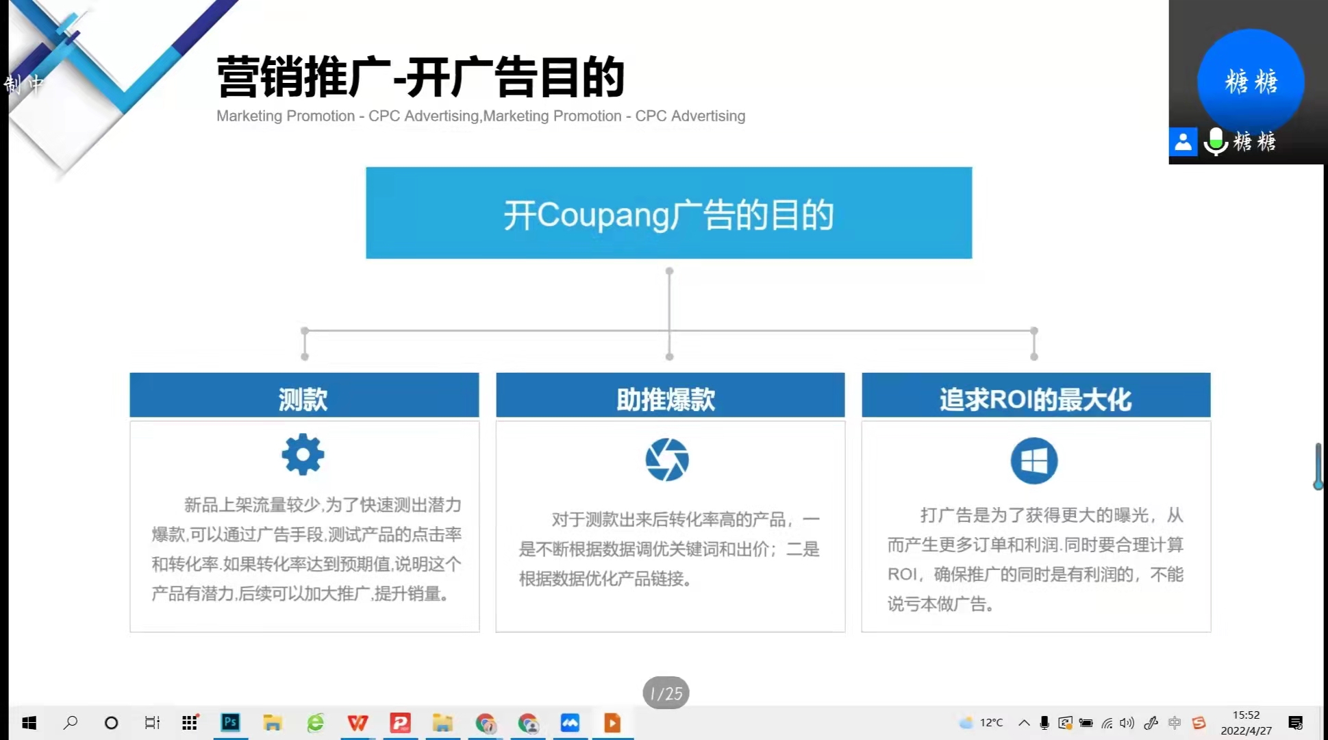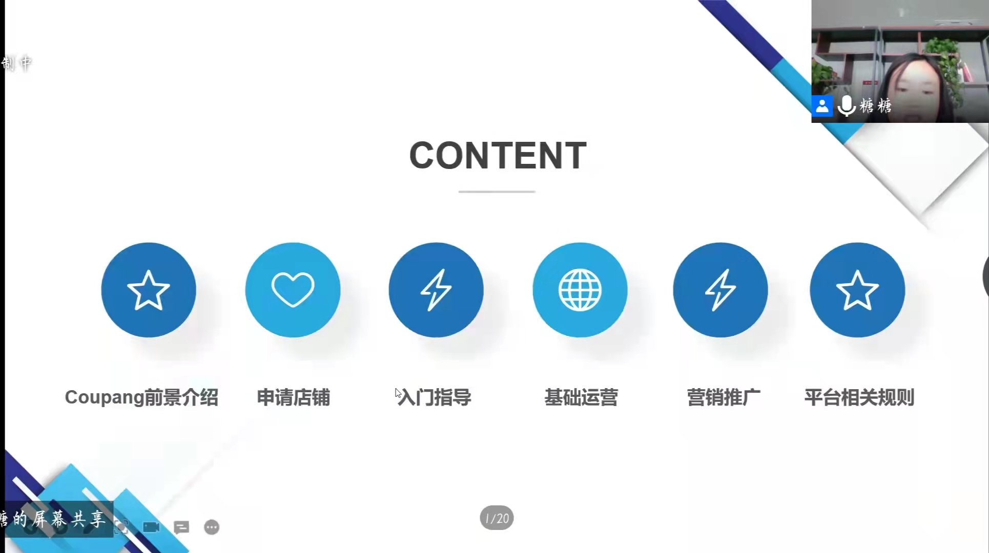 唐媛媛从CouPang平台的基本信息出发,介绍了平台发展前景,详细讲解了CouPang店铺的申请及入门要求,KYC审核和KC认证等。以CouPang平台基础运营为基础,唐媛媛深入讲解了平台营销推广等相关规则,并对同学们提出的问题做相关解答。