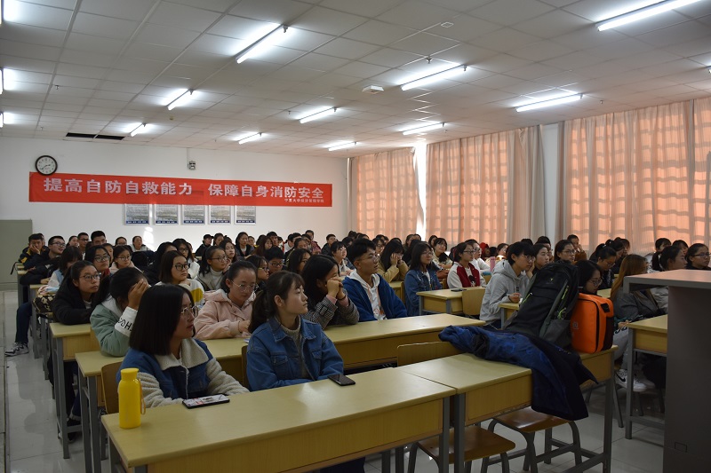 讲座伊始,主讲人以一段视频为同学们介绍了近年来校园火灾的情况。随后,他为同学们讲解了火灾发生的过程,令其了解到校园火灾易造成巨大伤亡,且学生宿舍是易发地点。因此,主讲人强调,学校应进行必要的防火安全教育,师生员工应接受必要的逃生训练,学生宿舍应做到人走断电,切忌在宿舍使用大功率违规电器。继而,主讲人为同学们介绍了消防用具的使用方法以及必要的自救措施。“只有绝望的人,没有绝望的处境。”在真正遇到火灾时,只有冷静机智地运用火场自救与逃生知识,才有逃生的可能。在讲座的最后,主讲人呼吁同学们应防患于未然,只有在灾难未发生时做好相关预防工作,才能在灾难真正来临时将损失降到最小,有备才能无患。