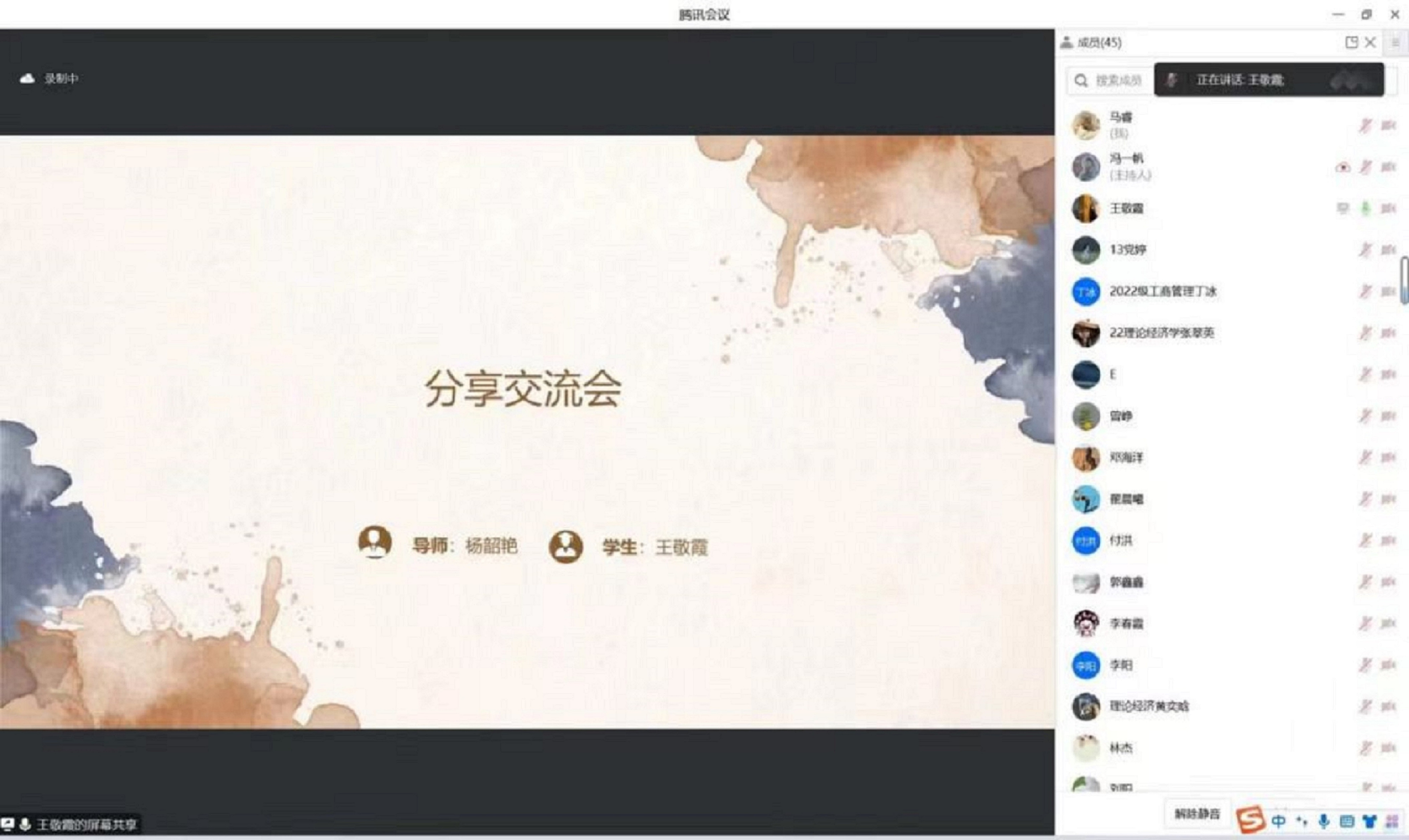 2021级理论经济学硕士研究生国奖获得者王敬霞及全体研究生参加会议。会议由张晨萱主持。