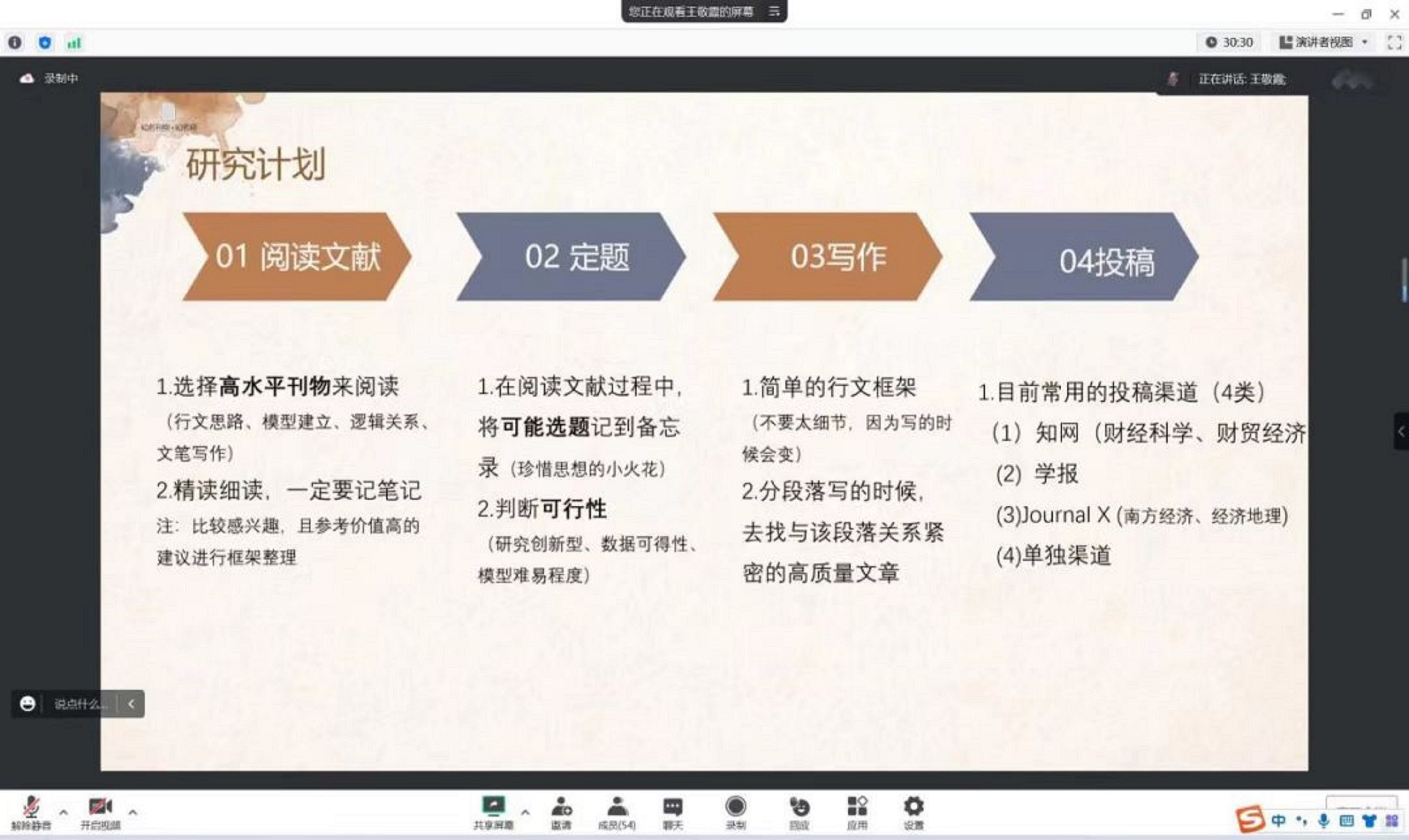 最后,王敬霞对论文写作与投稿经验进行了分享,并就阅读文献、确定选题、开始写作、投稿四方面进行了详细讲述。在交流讨论环节,王敬霞耐心并详细地解答了同学们的疑问。