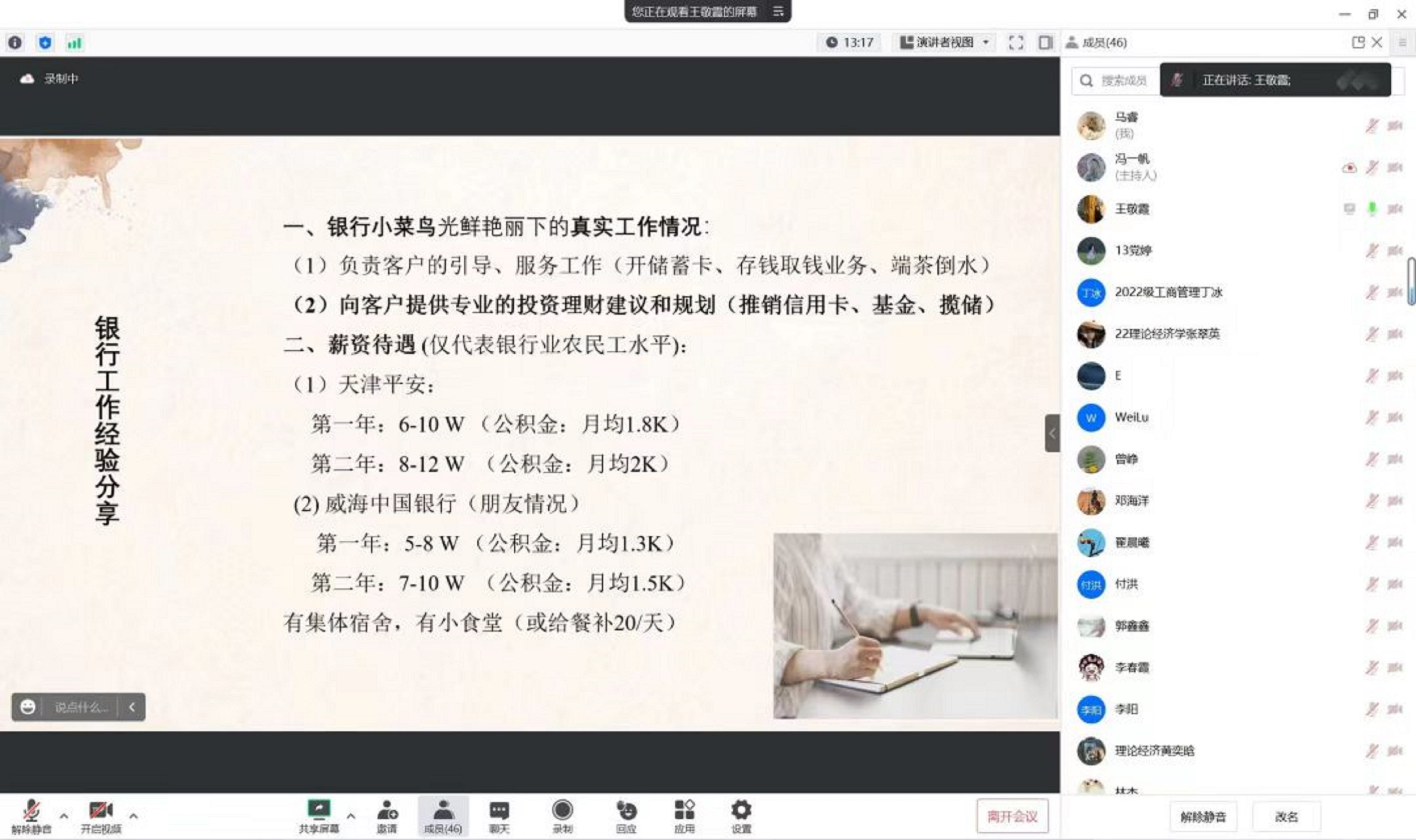 会议伊始,王敬霞从自己的银行工作出发对银行真实工作情况、薪资待遇以及目前的发展状况进行交流,以切身经验为想去银行工作的同学提供建议和指导。随后,王敬霞以自身学习生活为例给同学们指明学习和努力方向。王敬霞表示,在完成培养计划之余,同学们应在学术报告的撰写、英语水平的提高以及“挑战杯”等创新项目的申请等方面加强自身能力。