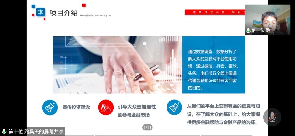 信息工程学院博士张鹏,西部(宁夏)智慧产业有限公司董事长、宁夏市外淘园农业开发有限公司董事长、自治区民政厅宁夏社会组织总会副会长王晓龙担任此次线上初赛的评委。本次大赛由冯蛟主持,宁夏金融工会、宁夏金融团工委等成员单位共计准备24个创意方案参加大赛。