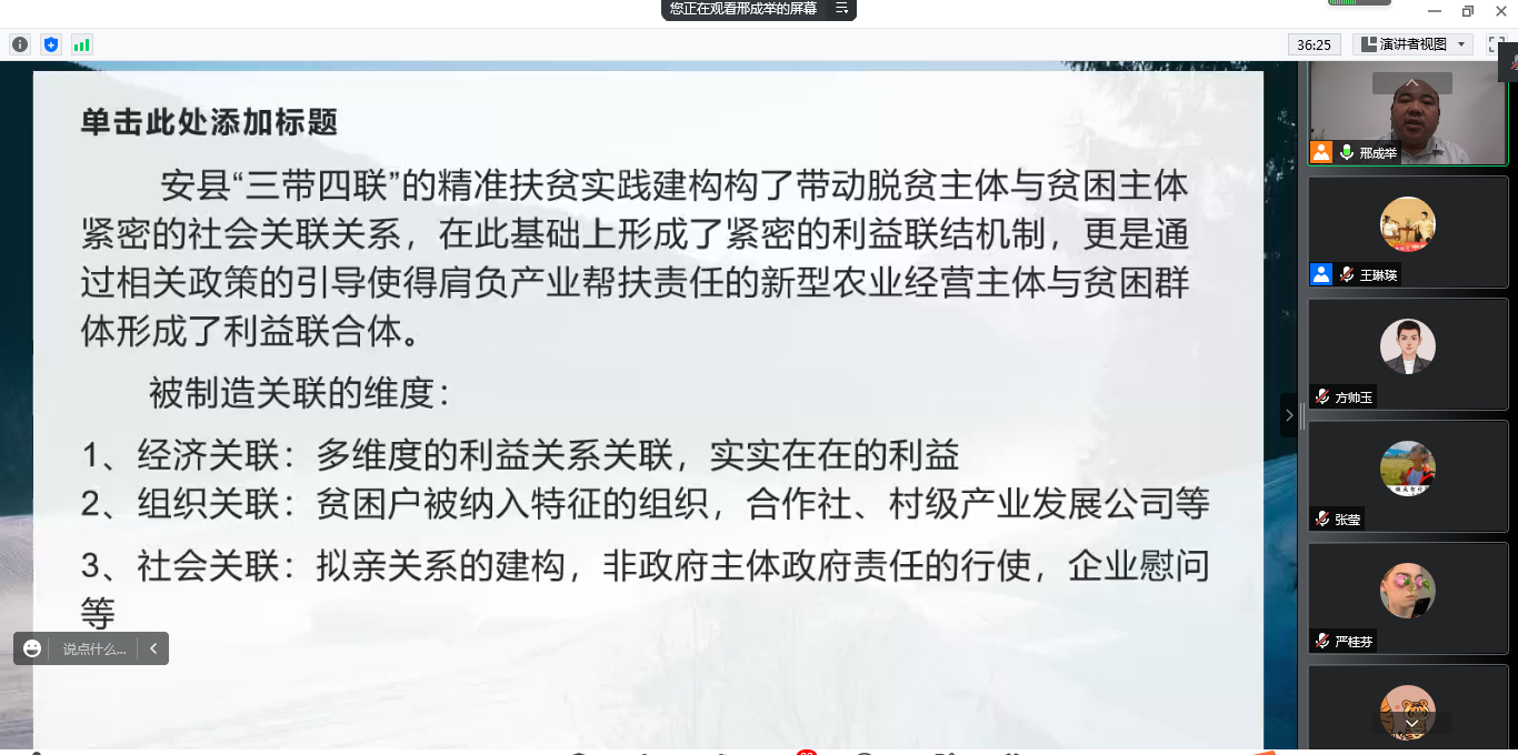农林经济管理教职工党支部线上举办了“耕读乡村”三农系列讲座第二讲。特邀西北农林科技大学人文社会发展学院副教授,社会学与社会工作系党支部书记,系主任邢成举担任主讲人,报告题目是“制造关联:精准扶贫实践中的利益关联与关系再构”。农学院党委副书记葛志军,欧美av
