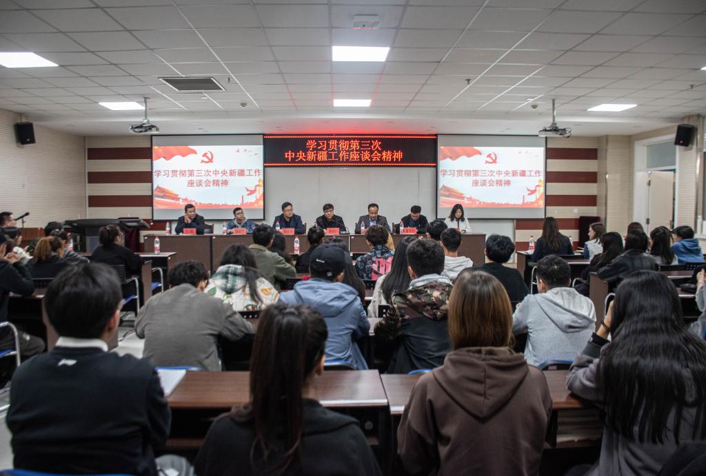 交流发言环节上,老师同学们畅所欲言。南疆女孩帕提古丽很有感触,她表达了对国家的衷心感谢,党的惠民政策让新疆籍同学有了更好的学习条件,也使得其他同学有机会了解更多新疆故事。针对同学们感兴趣的新疆国语教育发展情况,李有亮谈到近年来新疆国语教学进展顺利,基础教育设施得到明显改善,学校也在采取相应措施来帮扶学生。他建议学校可以组织有关活动来促进民族交流。王娜老师提到作为老师要多关心学生,新疆同学克服了各种困难,可以成为同学们的表率。我校对新疆同学的关爱,正是我校以人为本办学理念的生动体现。帕哈尔丁老师向同学们分享自己求学时期的经历,并以此鼓励同学们在大学阶段不断追求卓越,同时也要注重各民族同学之间的交流、交往、交融、交心。