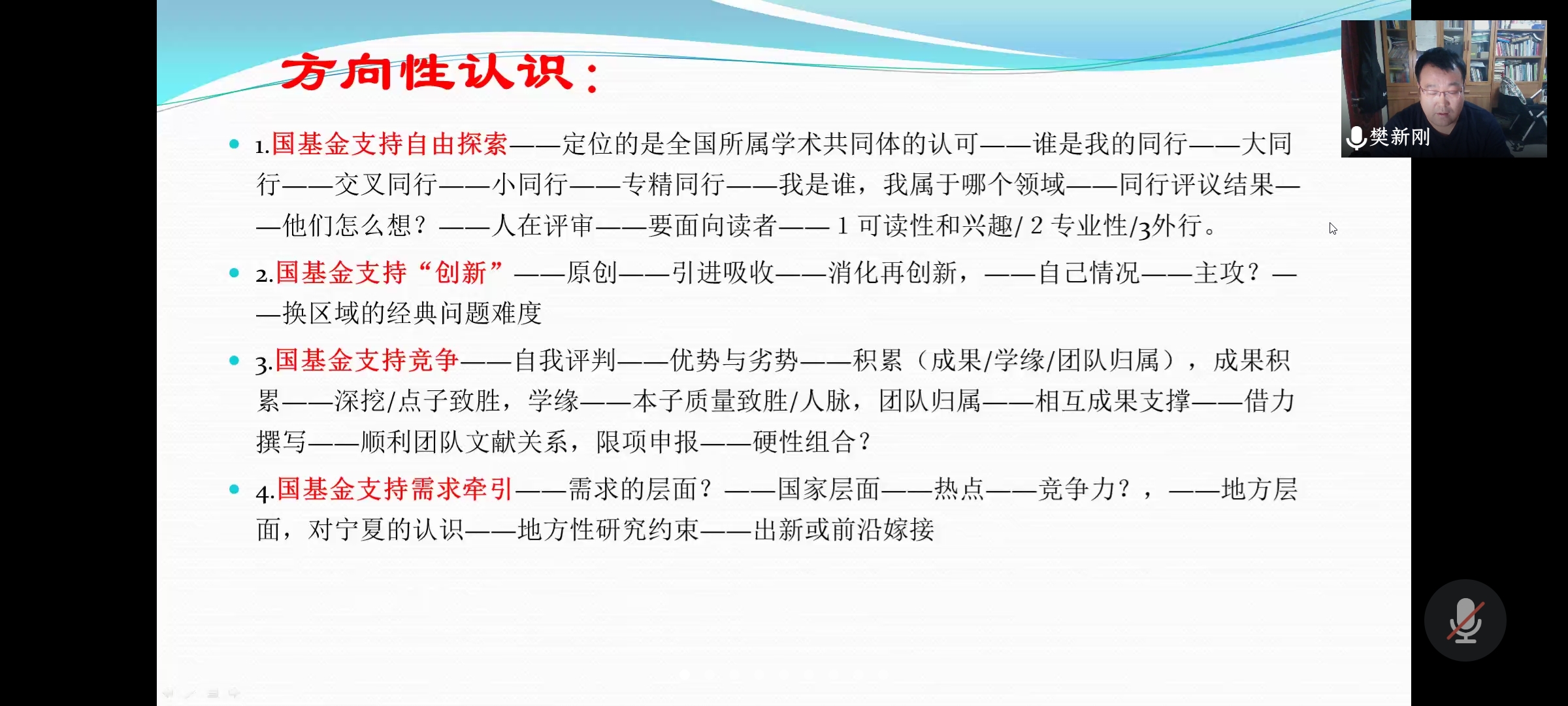 樊新刚老师从国家自然科学基金申请书的选题、写作、修改三个方面分享个人经验。在选题方面,樊新刚指出要认清学科位置,把握题目来源,题目要凝练而新颖。在写作方面要做到语言通顺,逻辑清晰,聚焦国内外进展,适当添加图表以丰富文章内容,并充分展现出个人的积累成果或团队的组合优势。在文章的修改中要做到标题具有概括性,文献具有权威性并与研究内容相贴合,技术路线具有充分可行性,研究内容体系化,能够支撑科学问题。另外,樊新刚老师谈及在申请书的撰写中要把握好“创新”这个关键词,研究内容要中肯,文章要具有说服力。