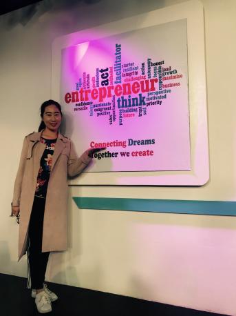 MBA 学生黄怿箴在丁丁电视创业LOGO处合影留念 |