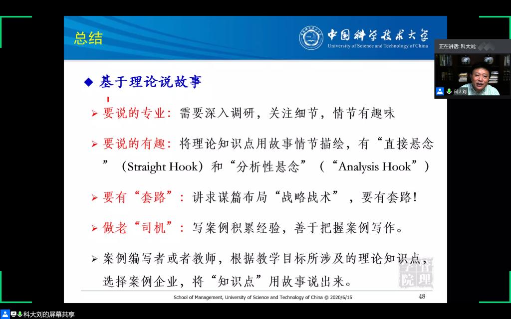 刘教授毫不保留地分享了自己采编案例的摘要、正文,刨析了优秀案例的写作风格,讲授了案例采编与学术论文的差异度,指出案例采编的起点即案例使用说明的统领意义。