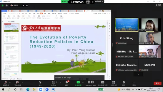 理论经济学教学团队承担了8个专题培训,《中国经济发展战略》《中国经济结构调整与产业链升级》由仇娟东副教授主讲,《中国财政收入与财政支出》《中国的分税制财政体制》由张会萍教授主讲,《“一带一路”沿线国家贸易投资便利化发展》《中国与“一带一路”沿线国家经贸产业合作》由杨韶艳教授、叶晨露老师主讲,《中国农村扶贫开发政策演变(1949-2020年)》由雷安琪副教授主讲,《中国农村减贫经验及典型案例》由杨国涛教授主讲。
