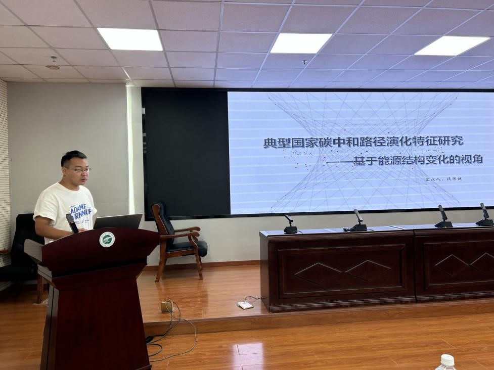 硕士研究生侯伟健汇报题目为《典型国家碳中和路径演化特征研究:基于能源结构变化的视角》。他使用8个典型国家碳排放及能源消费数据分析能源结构优化与改进对碳排放产生的影响,研究表明化石能源消费仍占据着主要地位,注重碳中和技术是建立在发达国家雄厚经济、特别是实现能源多元化的基础上,不同国家实现碳中和的具体路径并不相同。