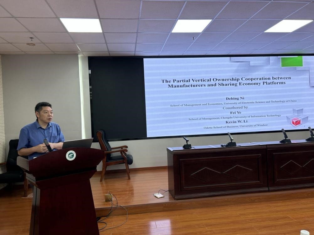 电子科技大学经济与管理学院倪得兵教授汇报题目为《The Partial Vertical Ownership Cooperation between Manufacturers and Sharing Economy Platforms》。他研究了制造商、共享经济平台、零售商、消费者和整个社会的PVO合作问题,认为在合作协商支付的情况下,PVO合作水平的提高可以产生制造商、零售商、共享经济平台、消费者和社会计划者的多赢结果。