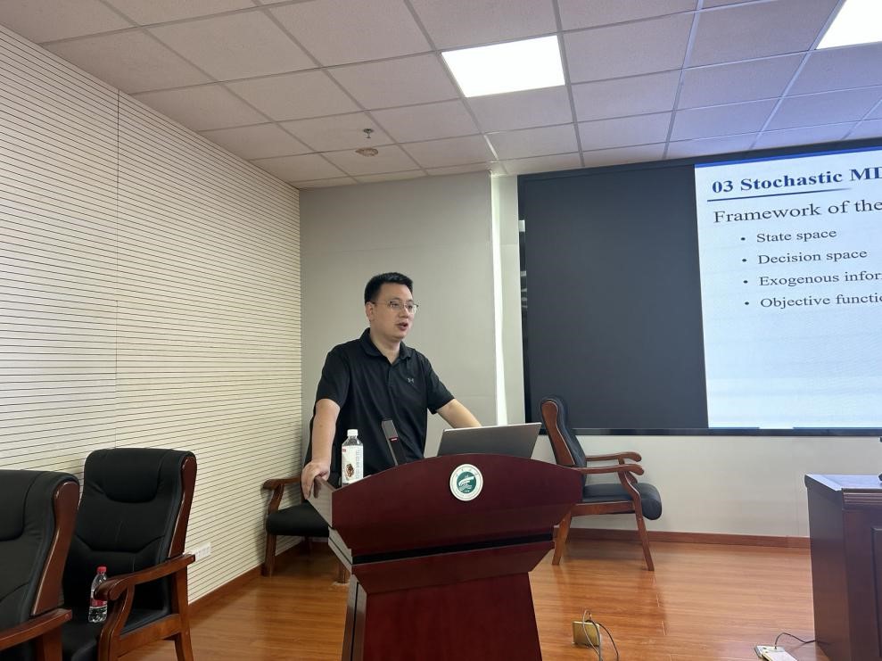 电子科技大学经济与管理学院晏鹏宇教授汇报题目为《An Online RL Approach to Charging and Order-Dispatching Optimization for an E-hailing Electric Vehicle Fleet》。他的研究尝试解决随机订单下网约车平台上电动汽车的最佳充电和订单调度问题,提出了一种在线Sarsa(∆)-SAA算法,以最大限度地提高平台的收益。