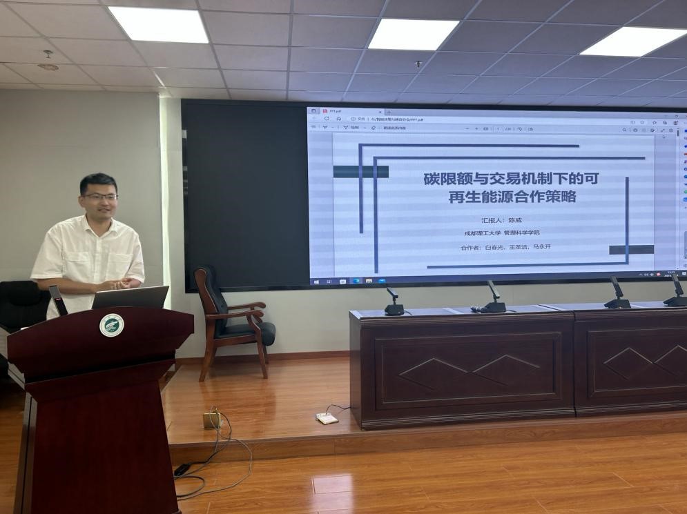 成都理工大学管理科学学院陈威研究员汇报题目为《碳限额与交易机制下的可再生能源合作策略》。他考虑了无合作、半合作和完全合作三种投资合作模式对供应链企业关键投资决策的影响,发现完全合作情形的发电商可再生能源投资量大于半合作情形下和无合作情形下,无合作情形下的售电商可再生能源投资量大于半合作情形下和完全合作情形下,且供应链整体的可再生能源投资量受可再生能源投资成本系数的影响。