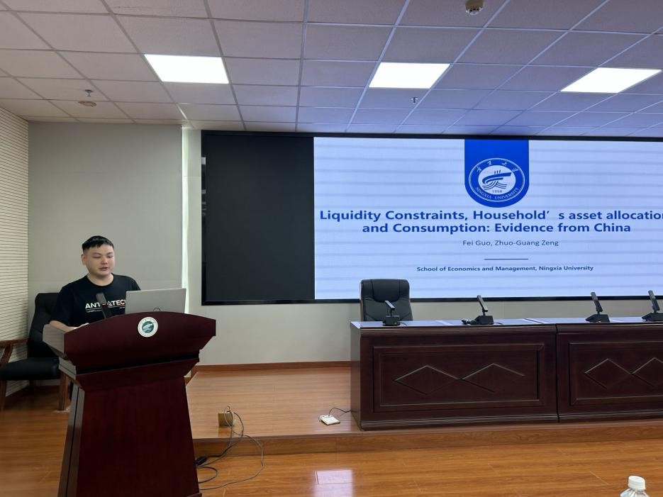 硕士研究生曾卓光汇报题目为《Liquidity Constraints, Household's asset allocation, and Consumption: Evidence from China》。他介绍了流动性约束对中国不同资产配置家庭的消费和边际消费倾向的持续影响,重点关注受到很强的流动性约束的“Hand-to-Mouth”特殊家庭群体,拟为促进消费稳定增长的政策制定提供新思路。