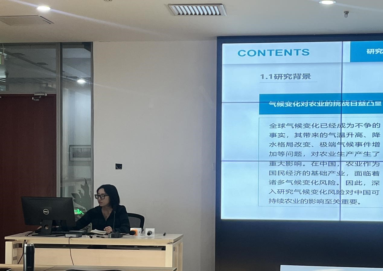 研究生张倩格报告论文题为《气候变化风险对中国可持续农业的影响:考虑外生变量的两阶段DEA模型》。论文基于2019~2023年省级面板数据,应用共同前沿下二阶段并行SBM-DEA模型评价了中国30个省域的可持续农业效率。研究发现:一是气候变化风险会对中国可持续农业的综合效率产生消极影响,全国范围和东西部的综合效率均值有所下降,效率改进空间增大。二是在气候变化风险影响下,全国地区综合效率分布左移,效率降低。三是阶段效率中农业生产阶段效率较高,可持续发展阶段效率较低。在气候变化风险影响下,两阶段效率均有所下降,其中对农业生产阶段影响更大。