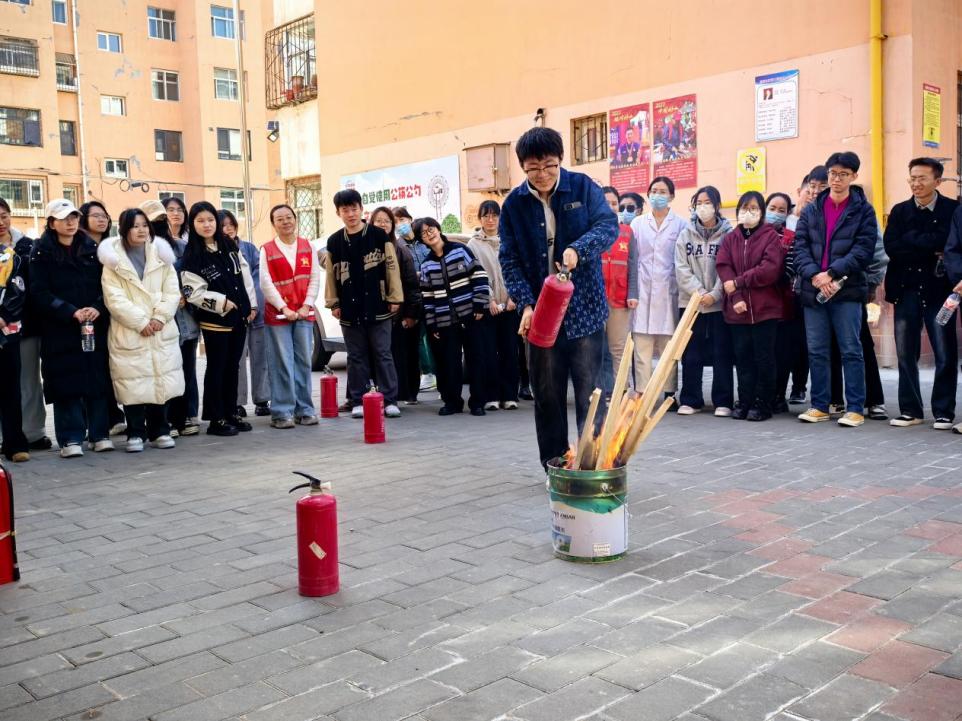 同学们在社区工作人员、应急专业人员的指导下,与社区居民共同开展应急安全演练活动。专业消防员现场讲解灭火器“提、拔、握、压”四步操作法,并指导学生轮流体验灭火实操。王同学亲历使用灭火器后兴奋地说:“没想到灭火器这么沉,但掌握了技巧就很有底气!”