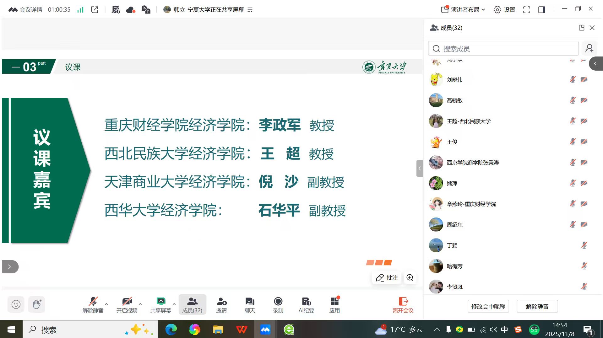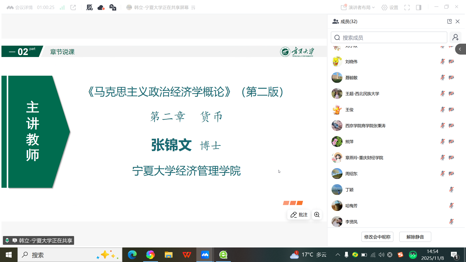 、重庆财经学院、天津财经大学等10余所高校32名从事《政治经济学》课程教学的老中青教师齐聚线上,共同就“货币”问题展开交流讨论。杨国涛院长代表学院致辞,强调了政治经济学课程的重要性和教学研讨的必要性,也提出了“教而不研则浅,研而不教则空”的建议和要求。