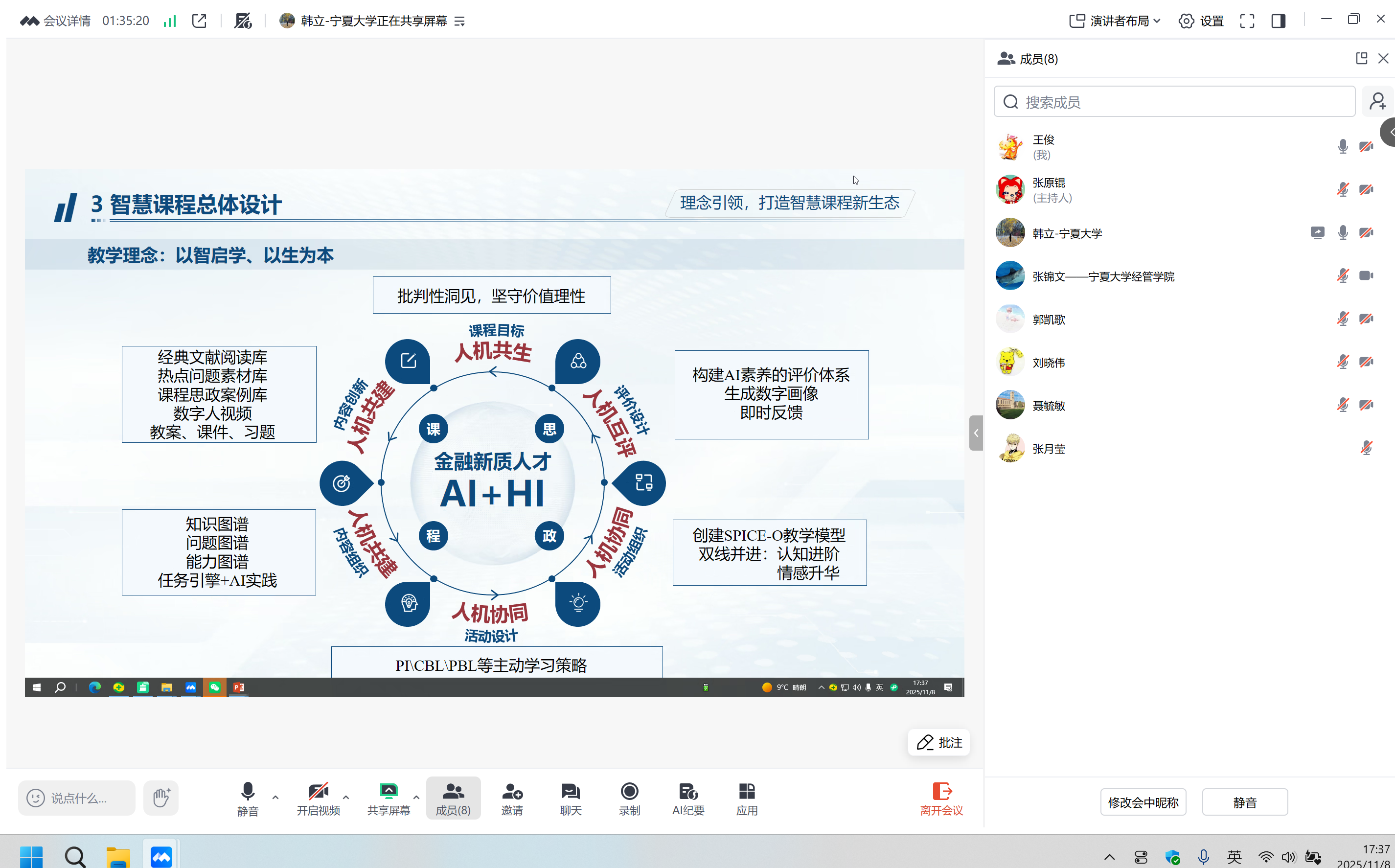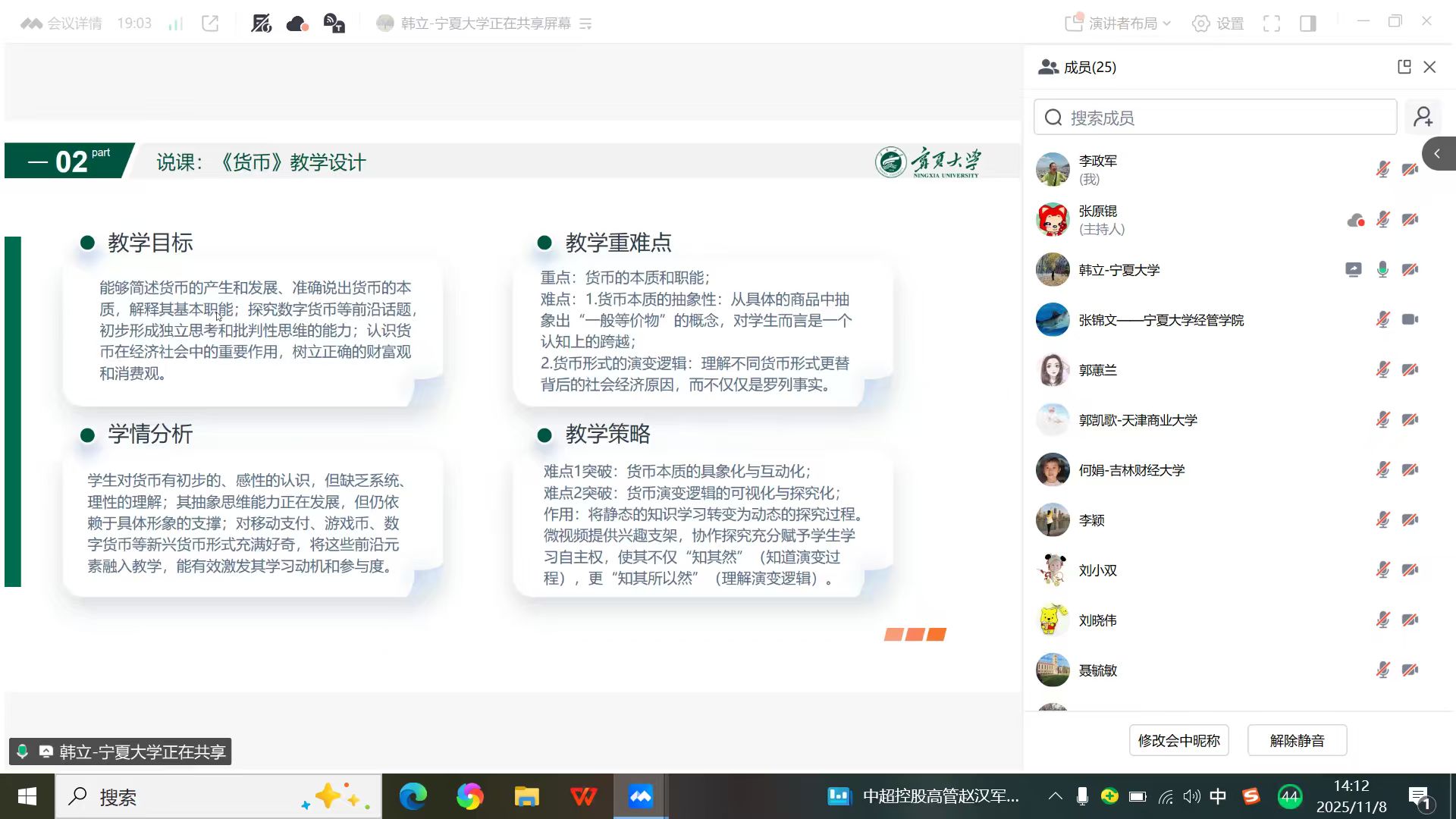 在说课环节,韩立教授分享了针对本门课程的“数智化教学设计框架”,展示了数智化工具在课程设计中的具体应用。并结合备课会说课内容“货币”,明确教学目标、分析学生学情,确立教学重难点及相应的教学策略。课程团队的张锦文博士进行了说课展示,重点分享了《货币》章节中的内容设计与知识点讲授。