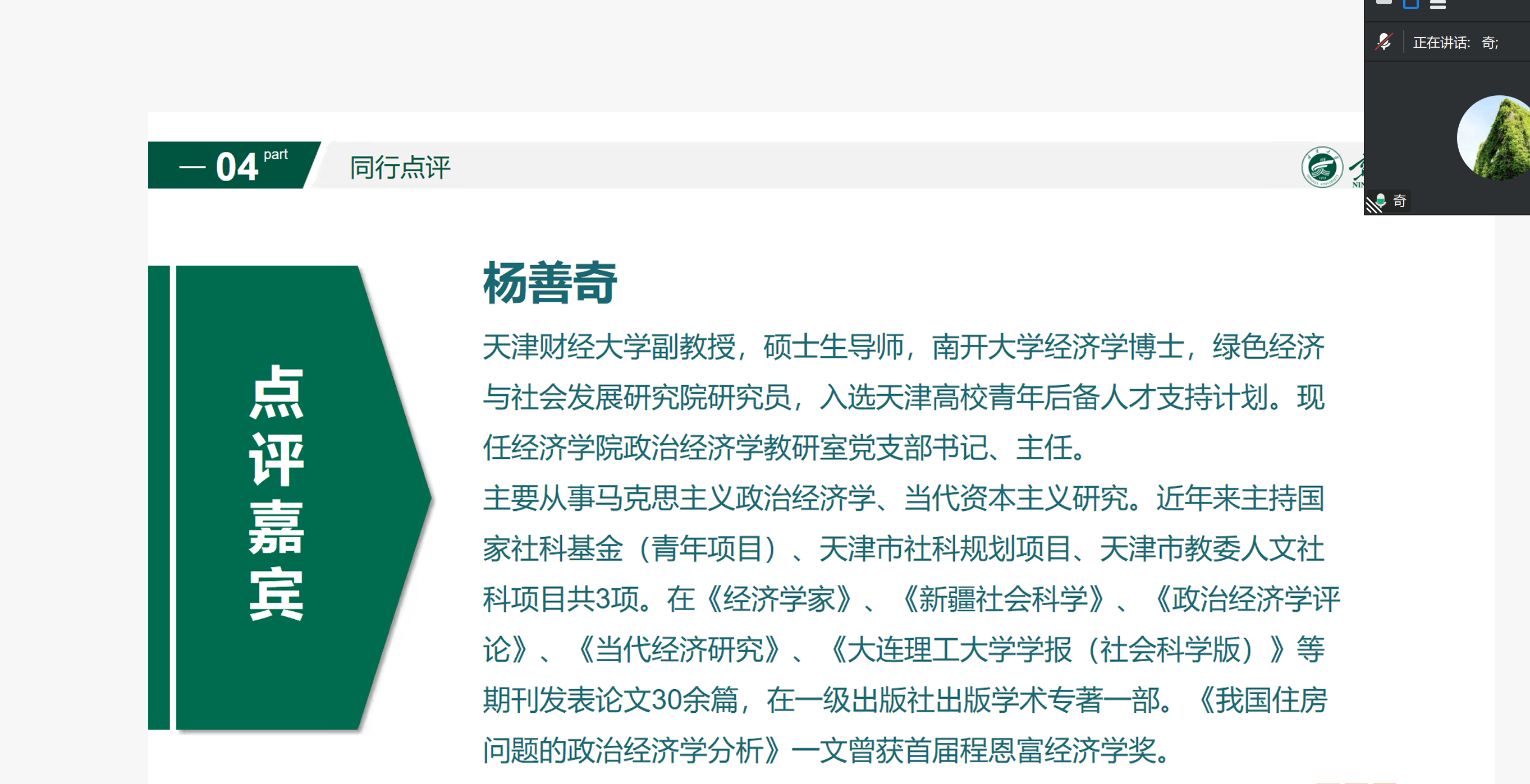 在同行点评环节,来自天津财经大学的杨善奇副教授,对《货币》章节的内容PPT设计、案例应用和知识点讲授思路给予了充分肯定,同时也分享了自己对货币职能内容的个人见解。