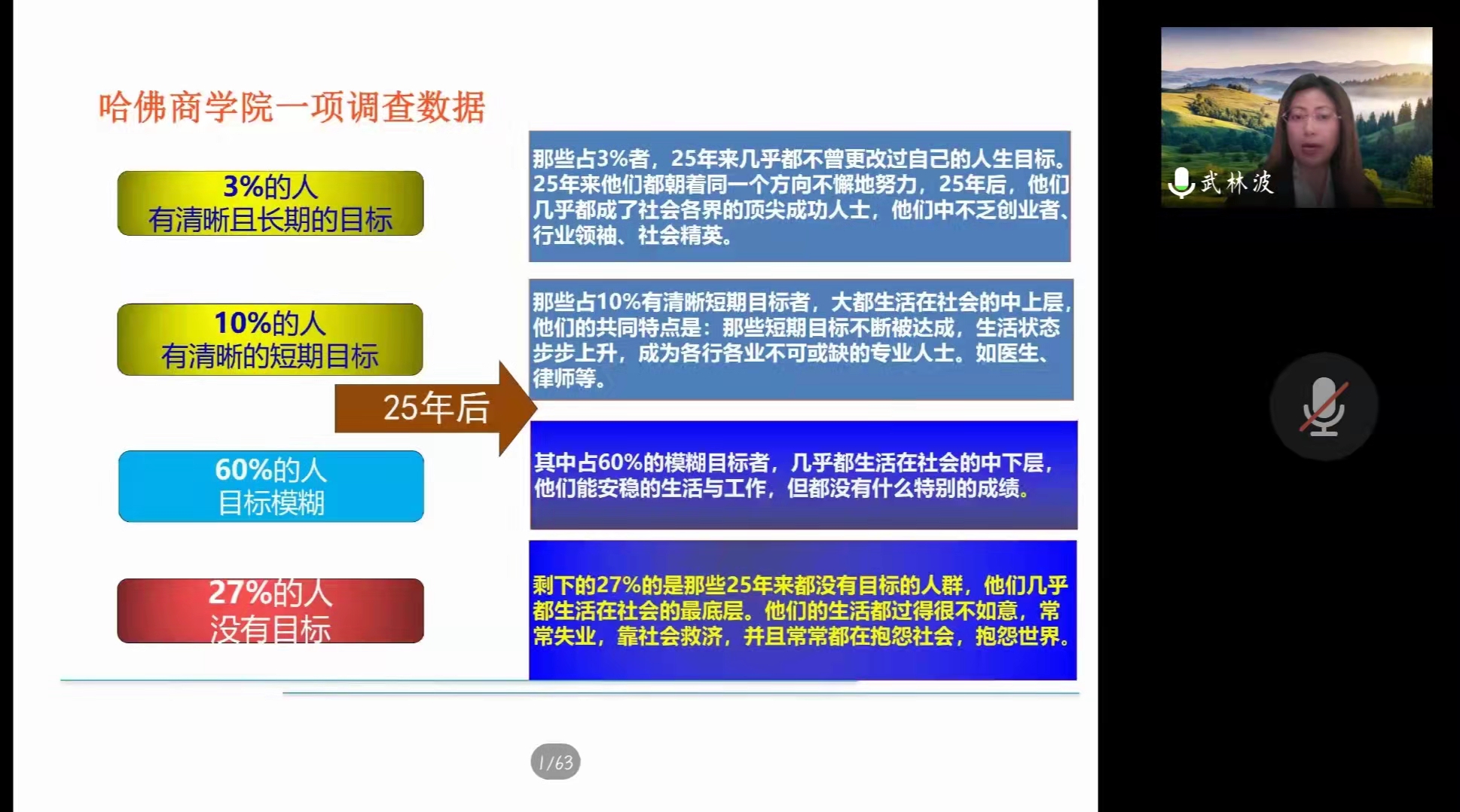 武林波通过SWOT分析讲解,希望同学们运用科学理论充分了解自己的优劣势,分析自己可能面临的职业机会和威胁,并以此制定出五年内的职业目标和行动计划。她建议同学们可以运用SMART原则明确目标,并通过讲述山田本一的事例告诫同学们制定目标不要好高骛远,应该循序渐进,明确长期目标是几个短期目标的结合。