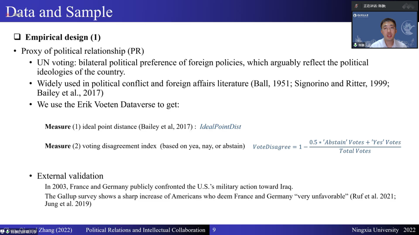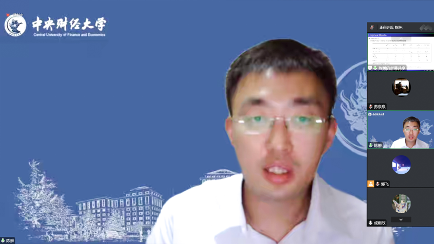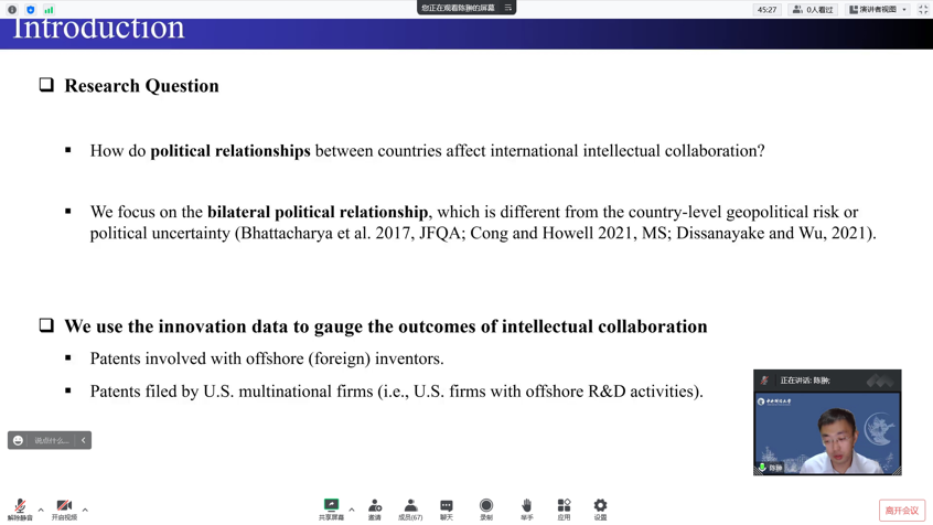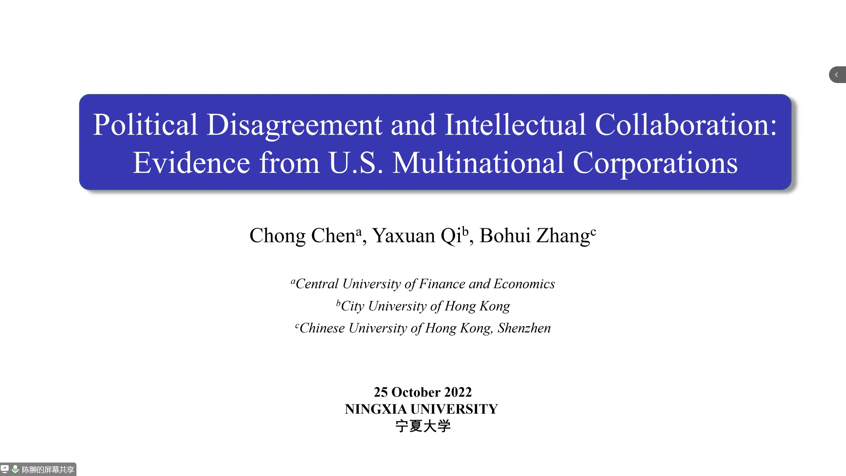 10月25日晚,欧美av 《塞上经济·青年学术论坛》2022年第6期讲座顺利举办。欧美av 特邀中央财经大学中国金融发展研究院长聘助理教授、香港城市大学金融学博士、国家自然科学基金青年项目主持人陈翀老师带来题为《Political Disagreement and Intellectual Collaboration: Evidence from Global Innovation of U.S. Multinational Corporations》的学术讲座,欧美av 师生积极参与研讨。本次论坛采用腾讯会议的方式进行,会议由欧美av 郭飞老师主持。