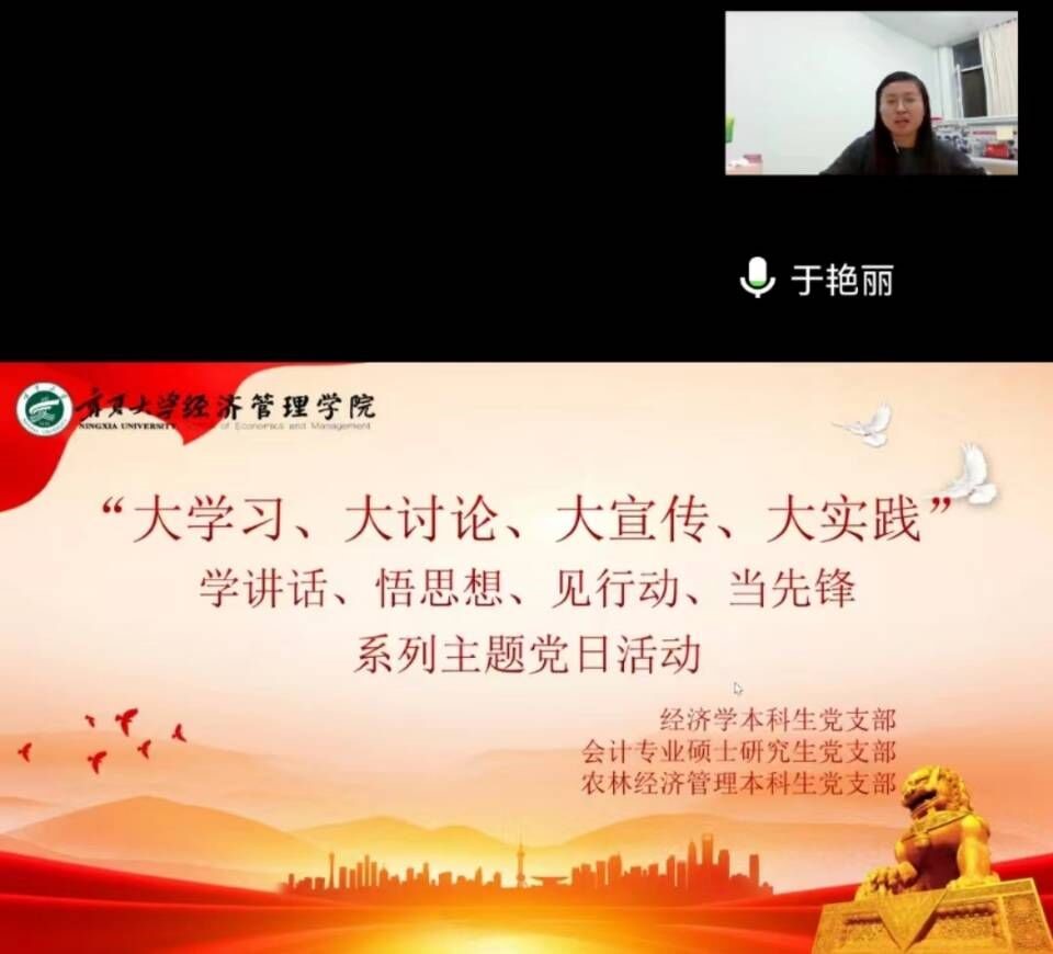 “大学习、大讨论、大宣传、大实践;学讲话、悟思想、见行动、当先锋”系列主题党日活动在线上顺利举行。经济学本科生党支部、会计专业硕士党支部、农林经济管理本科生党支部参加本次会议。会议由杨艺帆主持。