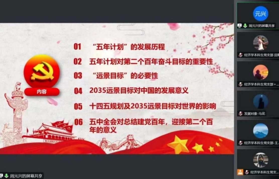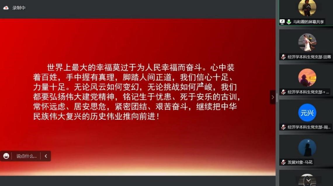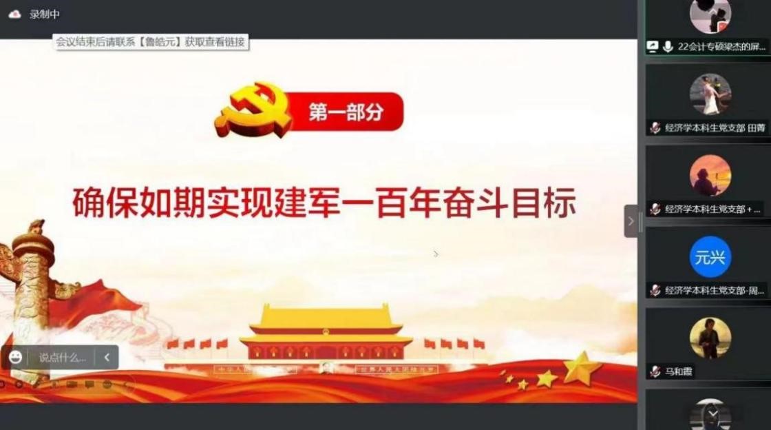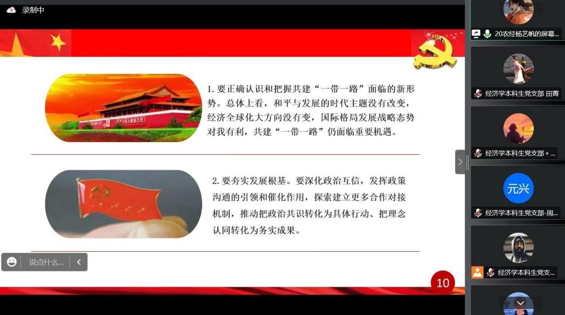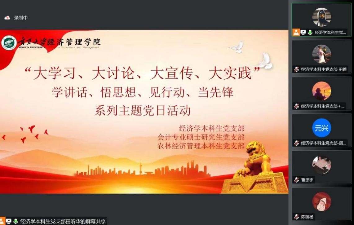 10月14日晚,欧美av “大学习、大讨论、大宣传、大实践;学讲话、悟思想、见行动、当先锋”系列主题党日活动第四讲于线上顺利举行。经济学本科生党支部、会计专业硕士研究生党支部及农林经济管理本科生党支部参加本次会议。会议由田昕华主持。