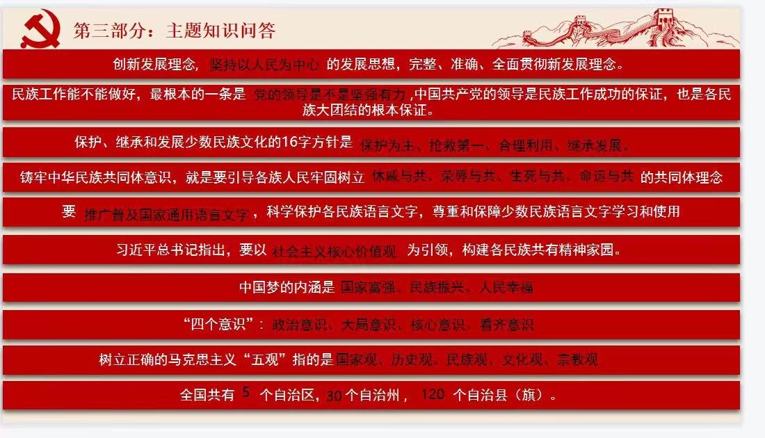 会议伊始,苏晓峰总结了近期工作内容,并组织观看视频《铸牢中华民族共同体意识》及《宁夏相关工作内容及成就》。在知识问答环节,各党小组争先恐后答题竞猜,共同讨论,气氛热烈。加强了支部党员对相关知识的掌握能力。