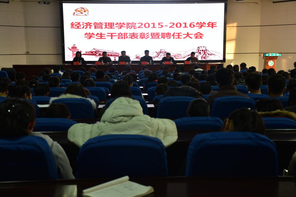 落座后,由黄旭兴介绍出席会议的领导及老师并宣布大会开始。之后,杨国涛院长宣读了表彰决定及表彰名单,并由院领导为优秀学生干部颁发荣誉证书。其次,院党委副书记桂晓兵宣读了学生干部聘任名单,由团委副书记辛学兰带领15届全体学生干部庄严宣誓。宣誓后,学生干部代表郭融同学做了发言。她对自己一年来的工作进行了总结,并鼓励学生干部要认真听取广大学生的意见,积极服务于同学。