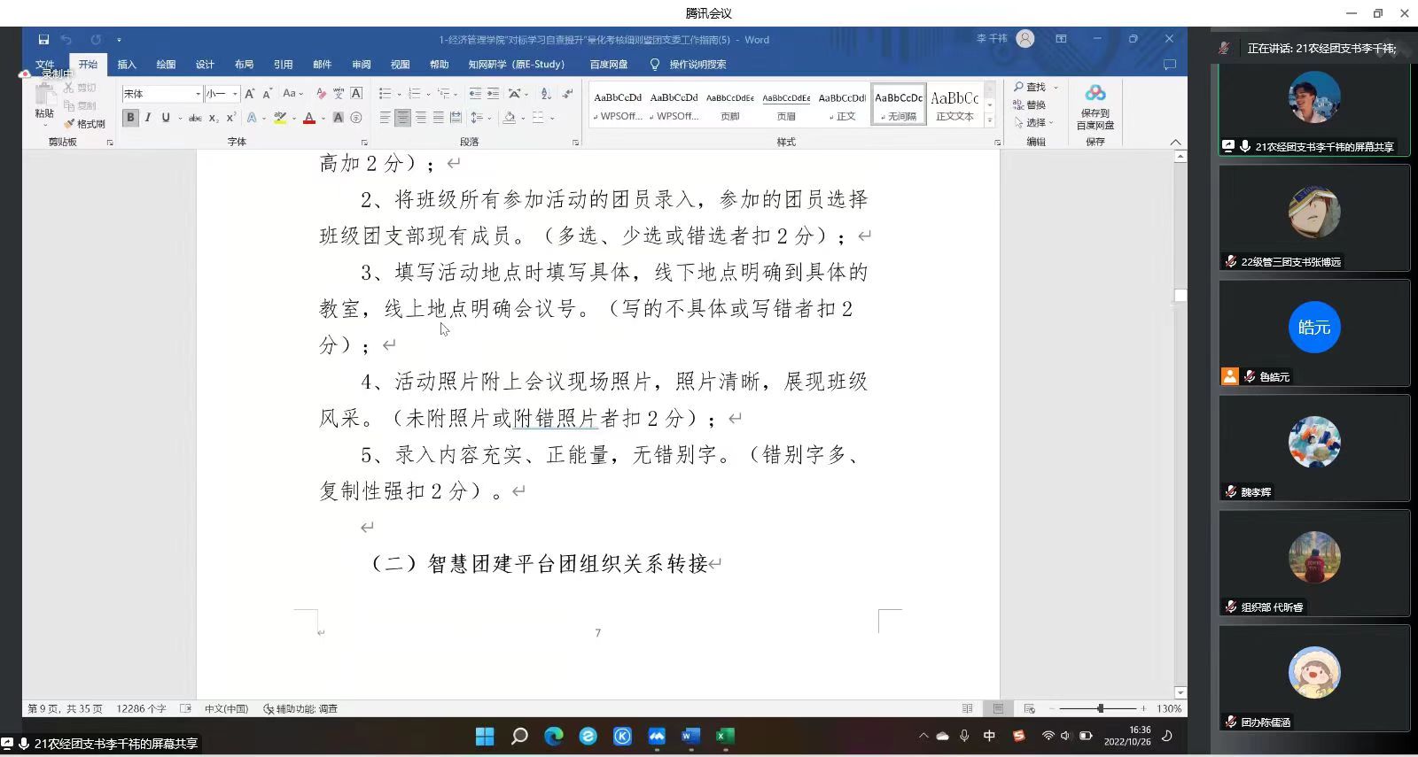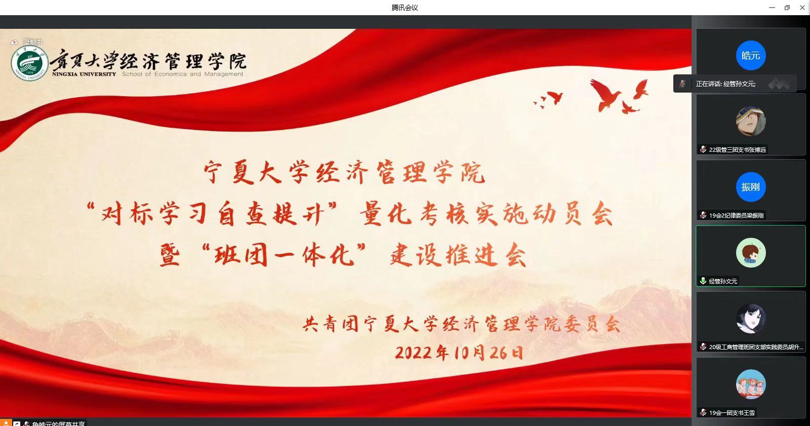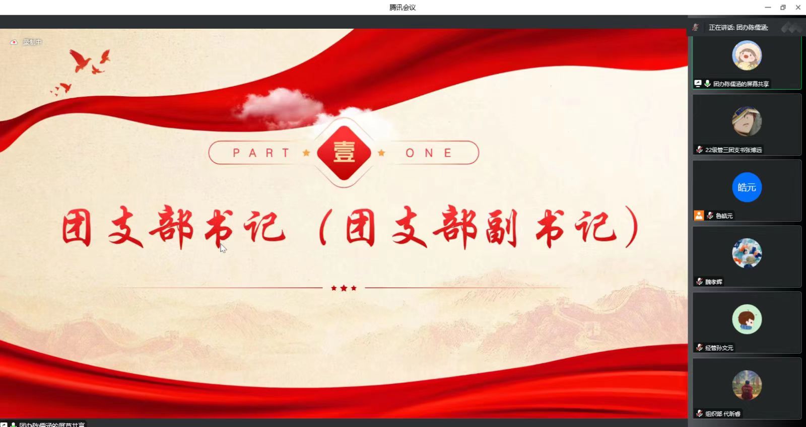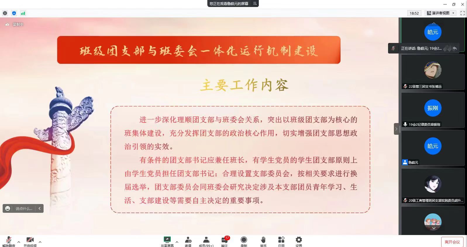 10月26日下午,欧美av “对标学习自查提升”量化考核实施动员会暨“班团一体化”建设推进会在线上顺利举行。欧美av 团委副书记孙文元,团委组织部、智课服务部、团委办公室全体成员及全体团支部支委参加会议。会议由鲁皓元主持。